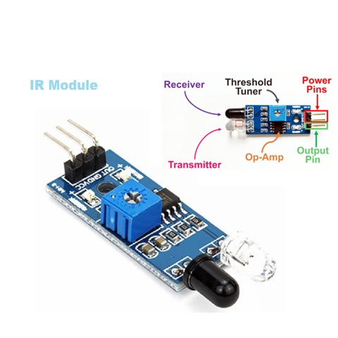 IR Emitter, IR Receiver, Comparator, Potentiometer, Indicator LED.